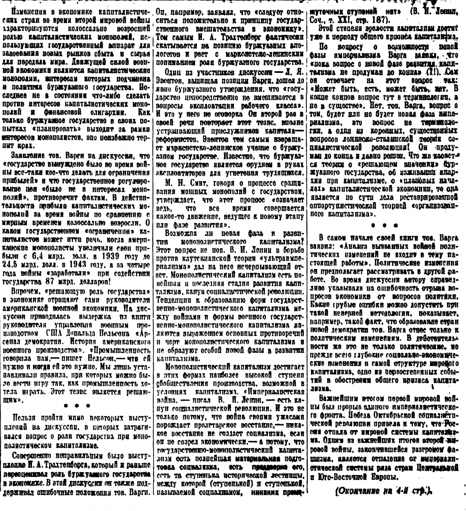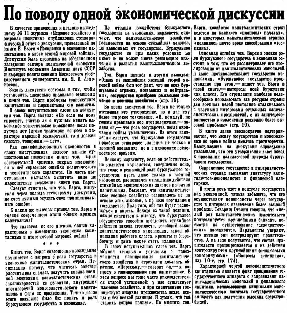От редакции: Полагаем, читателям этой статьи будет также интересно ознакомиться с материалом, напечатанном в газете «Правда» 26 января 1948 г. под названием «По поводу одной экономической дискуссии». Здесь помещаем первую часть этого материала.